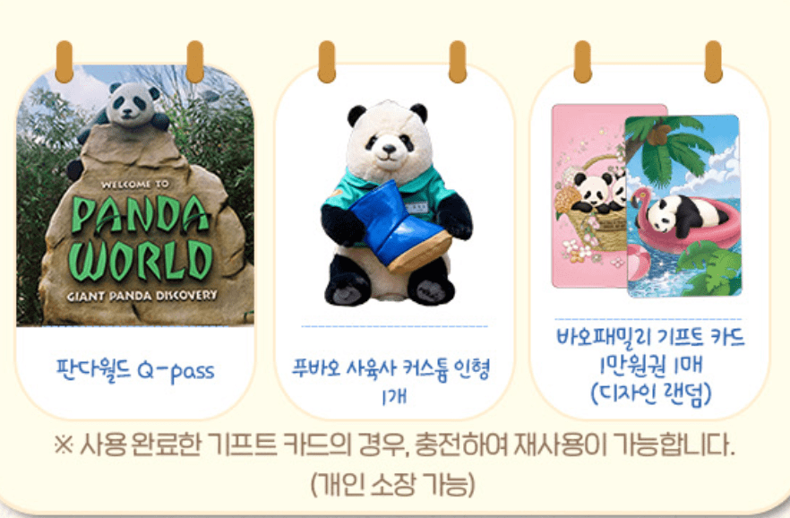바오 패밀리 패키지는 판다월드의 판다를 보러가시는 분들을 위한 패키지 입니다. 종일권과 더불어 판다월드 큐패스 이용권과 사육사 바오인형 1개, 바오 기프트카드 1만원권 1매가 포함된 구성입니다.